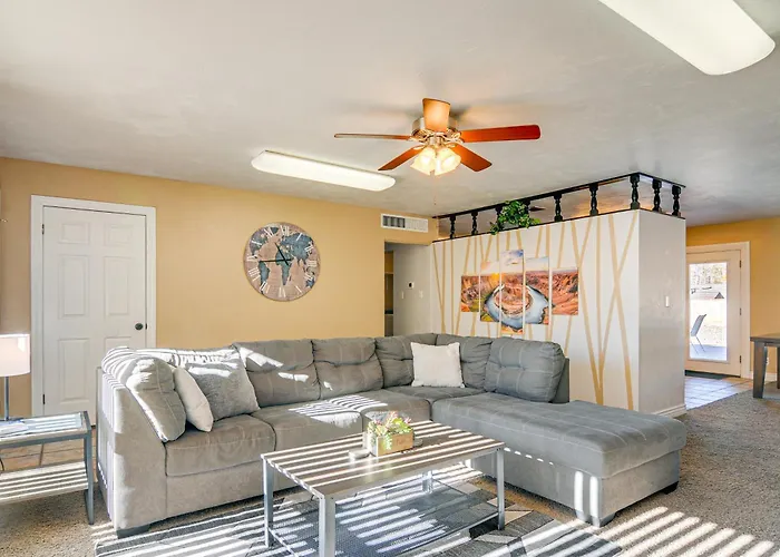 3 Mi To Glen Canyon Dam Home With Fenced Yard features an equipped kitchen including tea and coffee making equipment, a fridge, and a kitchenware for preparing meals. Big John's Texas BBQ as a dining choice is within a few blocks of this Page villa. Guests can reach 3 Mi To Glen Canyon Dam Home With Fenced Yard by car from Page Municipal airport in 5 minutes.